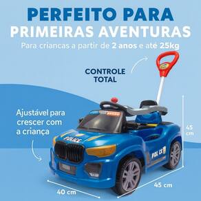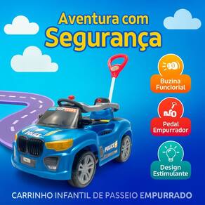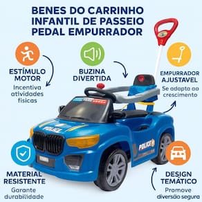 BM Car – Azul – Police Ref.: 3180Idade recomendada: +12 mesesSuporta até: 30 kgSelo INMETRO: 007281/2021 Prepare-se para viver intensas e emocionantes aventuras com o BM Car Police!A imaginação vai rolar solta, seja no passeio ou na brincadeira. Perfeito para acompanhar o crescimento da criança em duas fases: 2 Formas de Uso: +12 Meses – Passeio Assistido: