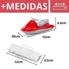 Tamanho da pick-up + jet ski: 39cm de comprimento, 10cm de largura e 11cm de altura. Tamanho da pick-up sozinha: 25cm de comprimento, 10cm de largura e 7,5cm de altura. Tamanho do jet ski: 12cm de comprimento, 05cm de largura e 4,5cm de altura. Tamanho da maca: 12cm de comprimento e 4,5cm de altura.