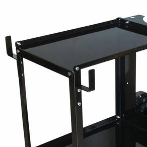 O carrinho possui duas rodas giratórias e duas rodas fixas, que facilitam o transporte em superfícies lisas ou irregulares. Além disso, conta com duas prateleiras laterais, perfeitas para o armazenamento de acessórios como eletrodos, consumíveis e ferramentas.