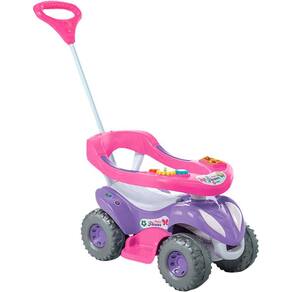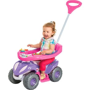 Para um passeio super confortável e charmoso! O carrinho super colorido é confortável e seguro para passear ao encaixar o cabo. Enquanto passeia, o bebê pode se divertir com as atividades didáticas no aro protetor. E é um brinquedo 2 em 1! Retirando a proteção e o apoio para os pés, o volante gira e o bebê pode brincar desenvolvendo a coordenação dos movimentos e impulso. O carrinho tem buzina e o assento ainda levanta para guardar acessórios e brinquedos.