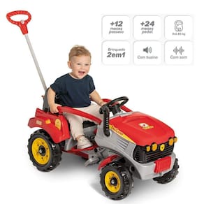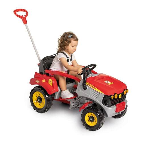Um trator para tornar a brincadeira mais divertida Direção e rodas guiadas pelo empurradorRodas com borracha para não derraparMais facilidade para pedalar com tração por correiaEncaixe e desencaixe o empurrador com praticidadeApoio de pé e aro protetor fáceis de removerTampa do motor abre para a brincadeira de mecânico começarAcompanha kit de chaves e parafusosCom cinto de três pontasCom som de trator + buzinaCalesita, transforma passeios em histórias Contém: 1 TraCamp1 Empurrador com suporte para bolsa1 Par de proteção lateral1 Par de apoio de pés1 Martelo/1 chave de boca/1 chave de fenda/4 parafusos1 Tampa motor1 Manual de instruçõesHabilidades desenvolvidas: Compreensão de causa e efeitoCoordenação entre olhos e pésCoordenação motora fina - mãos e dedosCoordenação motora grossa - braços e pernasCuriosidade e descobertaHabilidades Sensoriais Homologação Inmetro: IP-BRI-2163/2021-04 Ean: 7898179824090