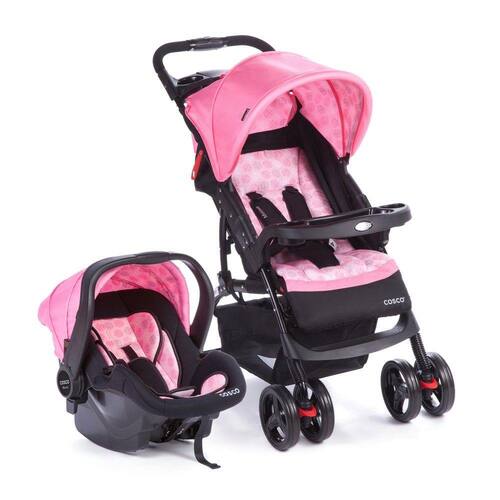 Carrinho com sistema fácil e prático de fechamento com uma mão permanecendo em pé depois de fechado e bebê conforto 3 em 1. 3 posições de reclínio do encosto incluindo o a mais deitada tipo berço, tecido lavável na máquina, bandeja frontal e traseira com porta-copos removíveis, apoio para os pés ajustável, capota retrátil com visor e bolso, amplo cesto para compras e cinto de segurança de 5 pontos. Aprovado pelo INMETRO conforme a norma ABNT NBR 14.389 para crianças do nascimento aos 15kg. Bebê conforto com estrutura resistente, alça com 4 posições: para ser usado com a base, para o modo balanço, transporte e fixo. Capa e acessórios que podem ser laváveis na máquina e cinto de segurança de 3 pontos. Aprovado pelo INMETRO conforme a norma ABNT NBR 14.400 para crianças do nascimento a 13kg (Grupo 0+).