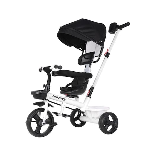 -Assento giratório 360°: mais interatividade e praticidade para os pais. -Capota removível: protege contra o sol e pode ser retirada quando desejado. -Cinto de segurança e proteção lateral: garante mais segurança durante o uso. -Empurrador dirigível: controle total dos pais na direção. -Assento anatômico com apoio para os pés: conforto ideal em todas as fases. -Cestos dianteiro e traseiro: espaço para brinquedos ou acessórios do bebê. -Pedais e rodas robustas: diversão com estabilidade e durabilidade. -Porta-copos prático: para manter a bebida sempre à mão. -Suporta até 25 kg -Recomendado para crianças a partir de 12 meses -Marca: Unitoys -Modelo: Confort -Cor: Preto ou Branco -Garantia: 3 meses