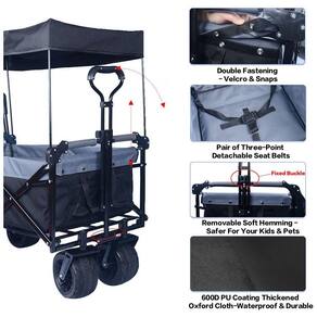 Quando dobrado, o carrinho tem um tamanho de aproximadamente 76 x 61 x 20 cm e um peso de aproximadamente 15,74 quilos. A alça telescópica é ajustável e pode ser estendida até 101 cm, proporcionando uma alça ajustável de 180 graus, permitindo que você empurre ou puxe o carrinho com facilidade. O carrinho também possui um cesto traseiro de 50 x 16 x 22 cm, uma bolsa térmica portátil à prova de vazamentos que mantém o frio por até 34 horas, muitos bolsos internos de armazenamento, um par de tiras de segurança de três pontos e um dossel removível que oferece proteção solar e à prova de chuva.