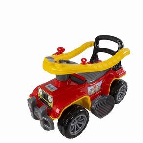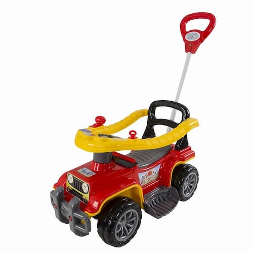 A haste gira para esquerda e direita, virando as rodas dianteiras, a mamãe e o papai tem controle total do carrinho. O anel de proteção levanta para facilitar o acesso à criança. A chave gira e o câmbio faz Creck Creck. A buzina tem som divertido.
