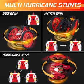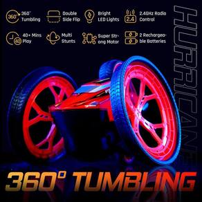 - 🕹? “MULTI CRAZY STUNTS, EXTREME TUMBLING” Com a ajuda de suas rodas grandes, este carro acrobático HURRICANE RC para crianças cria várias acrobacias malucas, girando como um forte furacão, como VERTICAL SPIN, R SPIN, SOMERSAULT, SIDE FLIP, 360 DEGREE LOOP e HURRICANE SPIN. Apresse-se! Mais e mais acrobacias aguardam sua descoberta e você será a favor dela!