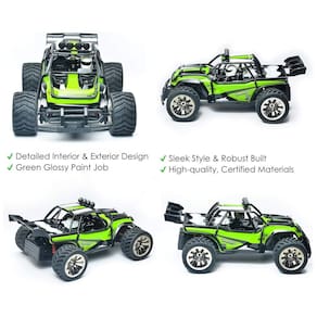 TECNOLOGIA Equipada com motor de alta intensidade. O sistema de suspensão independente de duas rodas torna a carroçaria mais flexível e cria uma tração constante. Frequência de amplo alcance de 2,4 GHz para melhor controle e reprodução simultânea. Design de absorção de choque e prevenção de colisão. QUALIDADE, QUALIDADE, QUALIDADE Pneus de borracha ocos super resistentes ao desgaste, de tamanho grande, macios e elásticos, adequados para todos os terrenos sujeira, lama, deserto, rochas, grama, cascalho, estrada de concreto e asfalto. Feito de nylon e alumínio de engenharia de alta qualidade, s para ABS , PVC , PC e não tóxicos. VIDA ÚTIL DA BATERIA tempo ideal de carga 2 3 horas, tempo de execução 12 15 minutos, alcance até 60 metros. Bateria recarregável de 4.8V 500mAh incluída, 3 pilhas AA de 1.5V para o controlador não incluídas FÁCIL DE USAR Pronto para executar, não é necessário montagem.