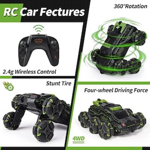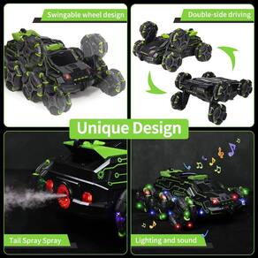 - Projetado com pneus anticolisão, o carro acrobático RC é adequado para ambientes internos e externos, como praias arenosas, pântanos, pastagens, etc. Equo com rodas flexíveis, o carrinho de brinquedo com controle remoto permite alta velocidade e melhor flexibilidade, sendo um presente de Natal ou presente de aniversário perfeito para crianças.