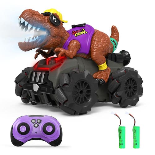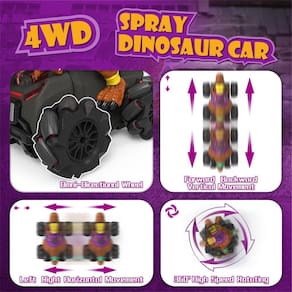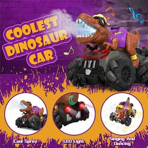 - [Cool Dinosaur Toy Car]: O carro com controle remoto de brinquedo de dinossauro Kizeefun é incrível! Sua aparência é um moderno T-Rex vestindo roupas de hip-hop e óculos de sol legais em um veículo mecânico futurista. Qual é a parte mais legal? É a capacidade do veículo de emitir luzes LED frias, e você pode até mesmo controlar o dinossauro para borrifar névoa de sua boca. E até toca música! As crianças ficarão completamente cativadas por isso!