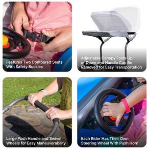 SEGURO E DIVERTIDO Equipado com cintos de segurança ajustáveis de fácil encaixe, volante funcional com buzina, porta-copos e um compartimento sob o capô para armazenar lanches e brinquedos, garantindo segurança e entretenimento durante o passeio.