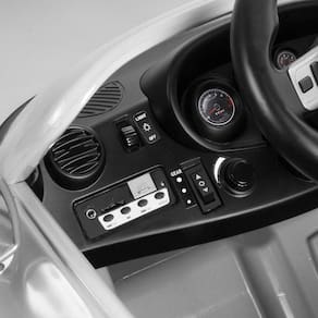 O Veículo Elétrico TT RS 12V com Controle Remoto tem buzina eletrônica no volante e um painel digital cheio de luzes que mostra a velocidade em tempo real. E ele ainda vem com uma alça para facilitar o transporte e rodinhas traseiras, entrada para áudio (iPod, MP3, USB), botão para ajuste de volume, músicas, modo aula de inglês, história e poema infantil (em inglês), ronco de motor e um controle remoto (codificado 2,4G com 3 opções de velocidade). Sua criança vai se sentir dirigindo um carro de verdade! O Mini Carro Eletrico TT RS 12V com Controle Remoto vem ainda com adesivos personalizados para deixar o brinquedo ainda mais incrível e parecido com uma grande máquina de miniatura!