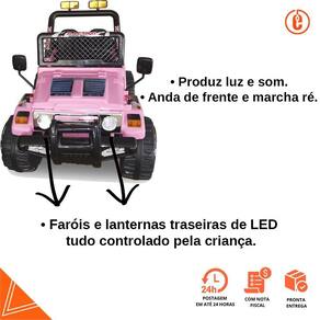 Possui marcha ré, faróis e lanternas traseiras de LED tudo controlado pela criança, central de mídia completa com entrada de USB além de um controle remoto para ativar todos os comandos de volume e luzes.