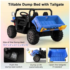 Desempenho poderoso fora de estrada 4 rodas extra grandes resistentes ao desgaste estão equipadas com suspensão de mola, proporcionando ao caminhão basculante um desempenho off road mais forte. Além disso, motores duplos potentes e bateria recarregável de 12V garantem uma diversão melhor e mais longa. As crianças podem dirigir suavemente o carro na estrada de asfalto, na estrada de cimento, etc.