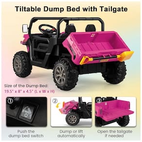 Desempenho poderoso fora de estrada 4 rodas extra grandes resistentes ao desgaste estão equipadas com suspensão de mola, proporcionando ao caminhão basculante um desempenho off road mais forte. Além disso, motores duplos potentes e bateria recarregável de 12V garantem uma diversão melhor e mais longa. As crianças podem dirigir suavemente o carro na estrada de asfalto, na estrada de cimento, etc.
