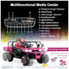 Caminhão de 2 lugares o caminhão basculante de 4 rodas possui 2 assentos e alta capacidade de carga de até 49 kg, o que é capaz de encantar 2 crianças pequenas ao mesmo tempo. Além disso, as funções de música embutida, entrada auxiliar, porta USB e conexão sem fio são muito divertidas. E o modo de balanço traz uma surpresa extra para seus filhos.