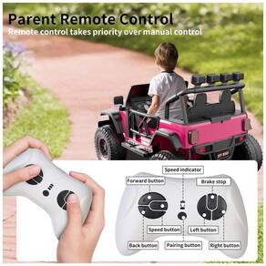 Dispõe de suspensão independente nas quatro rodas, pneus em PP antiderrapante, partida suave (soft start) e joystick ou volante para operação infantil. O controle remoto parental (alcance até 100 m) permite direção, mudança de sentido, ajuste de velocidade e acionamento da função de segurança com frenagem de emergência.