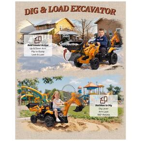 Escavadeira elétrica infantil JCB 3CX Licenciada, modelo 3 em 1: funciona como escavadeira, retroescavadeira ou mini carro passeio, com braços dianteiro e traseiro removíveis para adaptação e fácil armazenamento. Motor duplo de 120W alimentado por bateria de 24V proporciona alta potência e torque para terrenos de grama ou piso irregular. O banco reversível com engate rápido permite alternar entre os modos "piloto" (excavando ou dirigindo), e os estabilizadores laterais dão firmeza para operações de escavação. Certificada ASTM F963 para segurança, traz cinto de 3 pontos e rodas reforçadas para estabilidade.