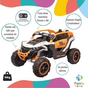 Inspirado em um Buggy real, ele possui uma estrutura robusta e estável, com rodas grandes e design de alta performance. Perfeito para os pequenos que adoram explorar a natureza, ele oferece uma pilotagem suave e potente, capaz de enfrentar diferentes tipos de terrenos. Equipado com uma bateria recarregável de 12v, garante longas horas de diversão com apenas uma carga.