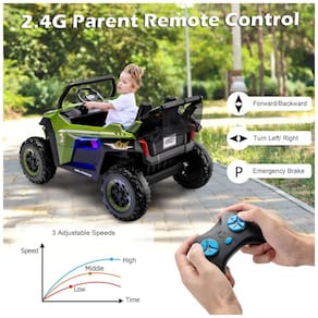 O UTV também inclui uma série de recursos de entretenimento, como música embutida, som real do motor e botões de buzina. Para tornar a condução ainda mais divertida, ele possui conectividade com USB, slot para MP3, FM e Bluetooth, permitindo que você toque as músicas favoritas das crianças durante a brincadeira.