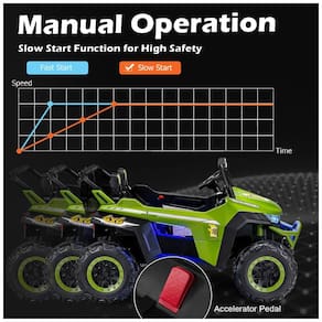 Para a segurança dos pequenos, o UTV oferece duas opções de velocidade, variando de 2 a 4 km/h, com uma função de partida suave que proporciona uma condução tranquila. A suspensão de mola nas 4 rodas garante uma viagem suave, absorvendo impactos e protegendo seus filhos. O carrinho possui dois modos de direção: as crianças podem dirigir usando o pedal, ou os pais podem controlar o veículo manualmente com um controle remoto de 2,4 GHz, oferecendo uma camada extra de segurança.
