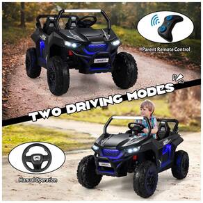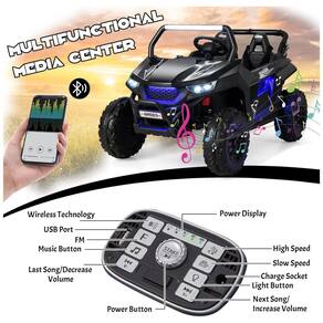 O UTV também inclui uma série de recursos de entretenimento, como música embutida, som real do motor e botões de buzina. Para tornar a condução ainda mais divertida, ele possui conectividade com USB, slot para MP3, FM e Bluetooth, permitindo que você toque as músicas favoritas das crianças durante a brincadeira.