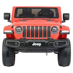 Pegue seus amigos e venha andar com a caminhonete Jeep Gladiator Rubicon Vermelho! Com assentos e cintos de segurança ajustáveis, este Jeep Gladiator alimentado por bateria acomoda até 2 crianças com uma capacidade máxima de 50 kg. Perfeito para jovens condutores de 3 anos ou mais.