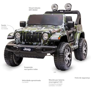 Com o Carro Elétrico Jeep Wrangler Bandeirante as crianças tem a divertida experiência de pilotar um Jeep de verdade! O Jeep Wrangler é perfeito para novas aventuras. Além do design idêntico ao veículo real, ele possui suspensão nas quatro rodas, faróis que acendem, portas e capô que se abrem de verdade. Com o Jeep Wrangler Bandeirante as crianças podem dirigir o carrinho livremente ou o adulto conduzir através do rádio controle.