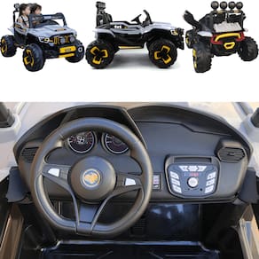 O carrinho vem com controle remoto, mas a própria criança também pode controlar o brinquedo. O Jipe Super Cross 4x4 está completo com suspensão nas quatro rodas, portas que abrem de verdade, cinto de segurança e alça traseira para facilitar o transporte do produto. E dá pra curtir algumas músicas no rádio do Jipe Super Cross 4x4, que vem com entrada USB e auxiliar! Quer mais? O Carro Elétrico Jipe Super Cross 4x4 12V da Zippy Toys possui ainda uma super buzina, farois traseiro, dianteiro e auxiliares que acendem de verdade, sons e luz no painel!