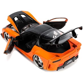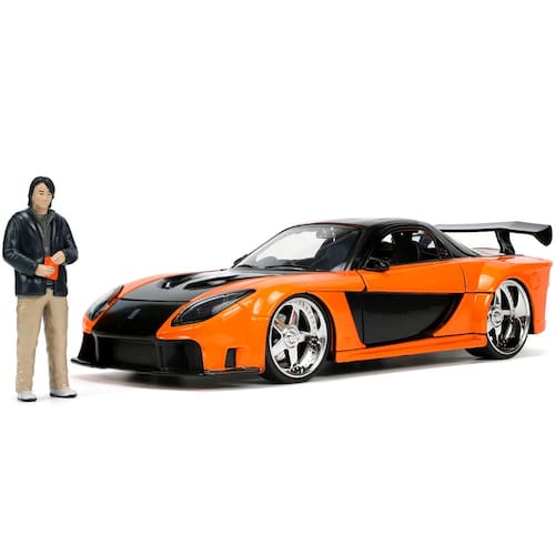 Carro fundido sob pressão Jada Toys Fast & Furious 1:24 1995 Mazda RX-7 de corpo largo com boneco fundido de 2,75" da Han, brinquedos para crianças e adultos — pneus de borracha reais. - Produto oficialmente licenciado. - Tem capô, portas e porta-malas com abertura. - Feito de fundição sob pressão com algumas peças de plástico. A estatueta Han tem aproximadamente 2,75 polegadas de altura.