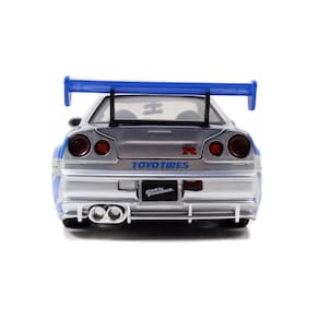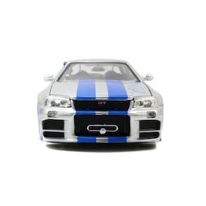 Carro fundido sob pressão Nissan Skyline R34 2002 da Jada Toys Fast & Furious Brian, escala 1:24, prata e azul, 19808 - 2 carros fundidos sob pressão Nissan Skyline R-34 Fast 2 Furious 2002 em escala 1:24. - MARCA ICÔNICA: A atenção aos detalhes e o estilo especializado aprimoram este veículo Nissan Skyline R-34 de 2002 - APRIMORAMENTOS: escultura altamente detalhada, detalhes de pintura premium e logotipos personalizados - PEGUE A ESTRADA: portas abertas, pneus de borracha premium - A partir de 8 anos