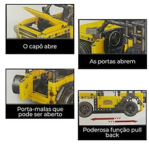 Especificações técnicas - material: peças em plástico abs resistente e não tóxico. - idade recomendada: +3 anos sob supervisão para menores de 5 anos . - número de peças: 478 inclui rodas, eixos, peças estruturais e acessórios . - funcionalidade: - sistema pull back movimento automático ao puxar . - partes móveis: capô, portas e porta-malas articuláveis. - cores principais: amarelo com detalhes em preto.