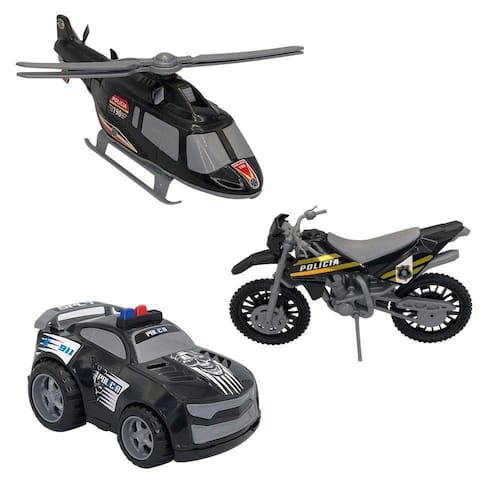01 KIT DE BRINQUEDO DE POLÍCIA COM CARRO, MOTO E HELICÓPTERO - PRETO
