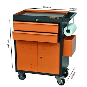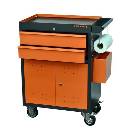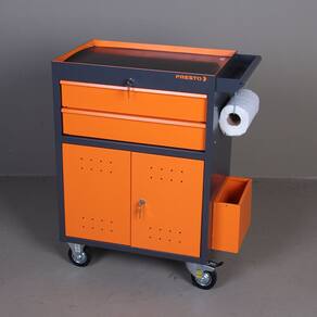 Carro Profissional p/ Ferramentas PRESTO c/ 2 Gavetas e Portas, fabricado em chapa de aço c/ baixo teor de carbono, c/ tratamento químico fosfatizante e antiferruginoso e pintura eletrostática a pó, o que garante uma proteção eficaz contra corrosão e um acabamento de alta qualidade.