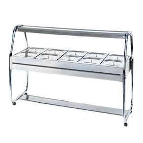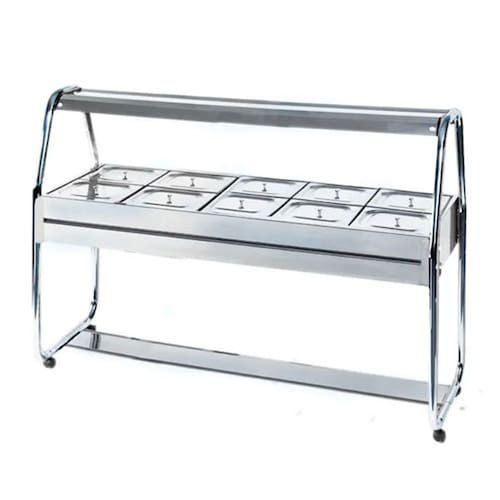 Self Service 10 Cubas para Salada Construído em aço inox brilhante AISI430, cubas gastronômicas (GNs) em aço inox AISI304, estrutura tubular com pintura eletrostática, rodízios com trava ou niveladores, protetor salivar em aço inox brilhante AISI430 e iluminação fluorescente. Voltagem 220V. Modelo SaladaGelo-x. Tamanho