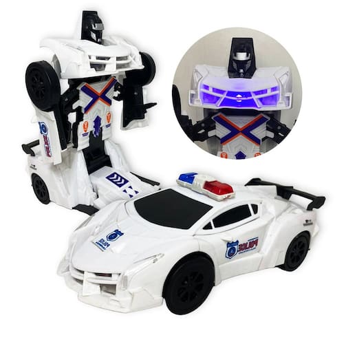 O Carrinho Policia se transforma em robô é um brinquedo muito interativo e para as crianças, ele diverte e entretém os pequenos com seus movimentos, músicas e LEDs. Possui sensor bate e volta, projeta luzes em 3D com os LEDs dianteiros e traseiros.