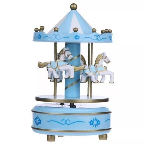 Peça especial e delicada, deixa qualquer ambiente com ar agradável. Ótimo para quartos infantis ou para presentear alguém especial Não necessita de pilhas Modelos Azul e Branco, Características: Funcionamento: Basta girar o Carrossel para dar corda Material - Madeira Dimensão: 18x10x10cm Peso: 290g anvisa/inmetro: 3036000437710 /