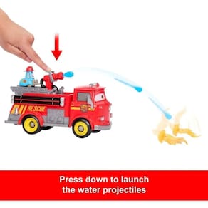 Um caminhão de bombeiros em grande escala, com os personagens Red e Guido integrados, garantindo a autenticidade e a diversão da franquia.