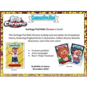 Cada caixa contém cinco (5) pacotes 2020 Garbage Pail Kids Chrome mais um (1) pacote bônus de violoncelo com três (3) bases Atomic Refractor Parallels. Cada pacote contém quatro (4) cartas básicas. O Garbage Pail Kids Chrome está de volta! O conjunto de cartas colecionáveis Garbage Pail Kids Chrome faz seu retorno triunfal, com personagens autênticos da Série 3. Colecione todos os seus personagens favoritos e alguns novos! Paralelos exclusivos! Autógrafos de artistas! Variações raras do C-Name!