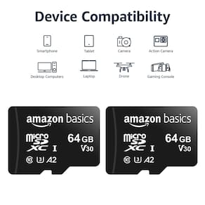 Cartão de memória Amazon Basics microSDXC UHS-I Classe 10 com adaptador de tamanho normal, A2, U3, V30, 4K, velocidade de leitura de até 100 MB/s, 64 GB (pacote com 2), para armazenamento de câmeras , preto