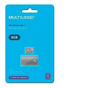 DescriçãoCarregue com você todos os arquivos e dados dos quais precisa. Este pen drive 2 em 1 da Multilaser tem 8GB de capacidade de armazenamento e é ideal para gravação de vídeos em HD e em Full HD. Com ele você não corre o risco de ficar sem seus arquivos ou músicas favoritas e, pode levá-los para qualquer lugar.Modelo: MC161;Material: Plástico e Componentes eletrônicos;Cor: Preto;2 Em 1: Leitor USB e Cartão de memória;Capacidade: 8GB;Compatibilidade: USB 2.0 e micro USB;Taxa de transferência: Até 480 Mb/s;Taxas de transmissão dados: 4MB/s Gravação até 20MB/s leitura;Voltagem de operação: 2,7V e 3,6V;Durabilidade: À prova de água, choque, vibração e temperaturas extremas.Marca: Multilaser;Conteúdo da embalagem: 1 Pen drive 2 em 1;Dimensões aproximadas do produto: 1,5 x 1,1 x 0,1 cm (A x L x C);Dimensões aproximadas da embalagem : 5 x 9 x 15 cm (A x L x P);Peso aproximado do produto: 0,01 Kg;Peso aproximado da embalagem: 0,1 Kg.
