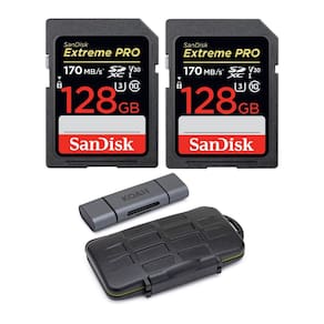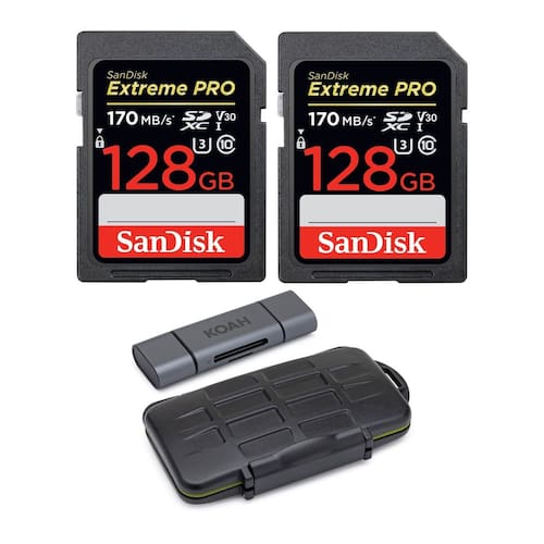 - O pacote inclui: 2 cartões de memória SDXC UHS-I UHS-I SanDisk de 128 GB Extreme PRO de 170 MB/s, leitor de cartão SD Koah PRO 2 em 1 Aluminium Shell OTG, estojo de transporte robusto de armazenamento de memória Koah PRO