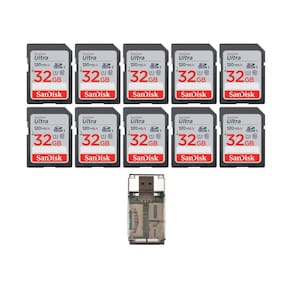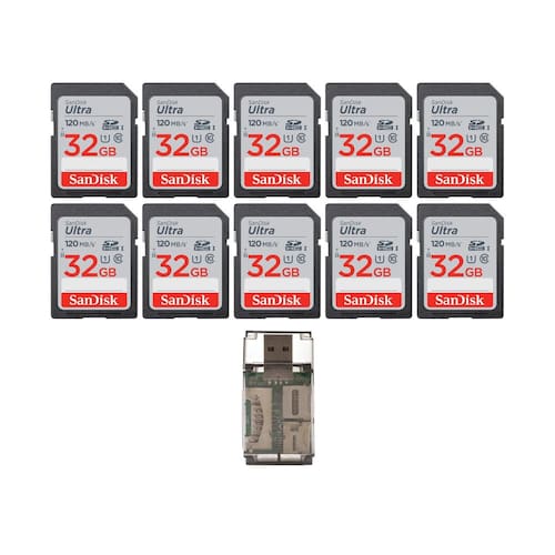 Tire melhores fotos e vídeos Full HD com suas câmeras compactas a médias. Com uma capacidade de armazenamento de 32 GB, há muito espaço para armazenar toneladas de fotos e vídeos Full HD. Este cartão SanDisk Ultra SD é rápido com desempenho excepcional de gravação de vídeo para permitir que você capture suas memórias quando elas acontecem. Mais tempo, mais memórias Economize tempo com velocidades ultrarrápidas para ajudar você a mover rapidamente suas fotos e vídeos Full HD – transfira até 875 fotos em um minuto. Continue fotografando Com 32 GB de armazenamento para que você possa tirar toneladas de fotos e horas de vídeo Full HD (1080p) sem trocar o cartão. Não perca o momento O cartão SanDisk Ultra SD é rápido com desempenho excepcional de gravação de vídeo UHS-I para permitir que você capture suas memórias quando elas acontecem. Resistente à água, flutuações de temperatura O cartão SanDisk Ultra UHS-I é testado quanto à durabilidade para proteger suas memórias dos acidentes da vida — à prova d'água, à prova de choque, à prova de raios X e à prova de temperatura. Compatível com leitor de cartão SanDisk SD UHS-I Use com o leitor de cartão SanDisk SD UHS-I para que você possa mover seus arquivos rapidamente. O pacote inclui: 10 cartões de memória SanDisk 32GB Ultra UHS-I SDXC Leitor de cartão de alta velocidade - O pacote inclui: 10 x cartão de memória SanDisk 32GB Ultra UHS-I SDXC e leitor de cartão de alta velocidade - Capacidade: Este cartão oferece até 32 GB de armazenamento para que você possa tirar toneladas de fotos e horas de vídeo Full HD (1080p) sem alterar o cartão - Resistente à água, flutuações de temperatura: o cartão SanDisk Ultra UHS-I é testado quanto à durabilidade para proteger suas memórias dos acidentes da vida — à prova d'água, à prova de choque, à prova de raios X e à prova de temperatura - Compatibilidade: Este cartão é compatível com dispositivos SDHC/SDXC e SDHC-I/SDXC-I. Use-o com um leitor de cartão SanDisk SD UHS-I para que você possa mover seus arquivos rapidamente - Mais tempo, mais memórias: economize tempo com velocidades ultrarrápidas para ajudá-lo a mover rapidamente suas fotos e vídeos Full HD – transfira até 875 fotos em um minuto
