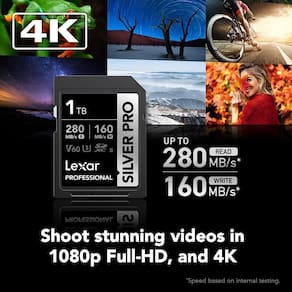 O cartão lexar professional silver pro sdxc uhs-ii oferece até 280 mb/s de leitura e 160 mb/s de gravação para que você possa capturar vídeos impressionantes e imagens estáticas imaculadas - e economizar tempo na transferência e backup de seus arquivos. Além disso, vem com capacidades de até 1 tb para que você tenha espaço para ficar no momento e continuar fotografando. Ean: 843367131730