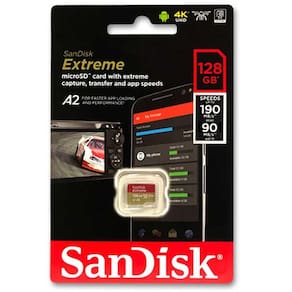 Cartão de memória microSDXC SanDisk com 128GB de capacidade de armazenamento, velocidade de leitura de até 190MB/s e velocidade de gravação de até 90MB/s.