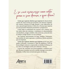 Cartas que respiram, histórias que inspiram foi desenvolvido a partir de cartas escritas por pacientes com doenças respiratórias crônicas, doenças de longa duração e sem expectativa de cura, cujo principal sintoma é a falta de ar. Doenças que impõem aos seus pacientes limitações persistentes e progressivas. Conta sobre os sofrimentos de conviver com a doença, que vão muito além dos sintomas, e interferem no relacionamento com familiares, amigos, trabalho, vida social, mas, acima de tudo, na relação consigo mesmo e na sua aceitação. São histórias emocionantes de lutas, batalhas, frustrações, mas também de muita superação e resiliência. Heróis anônimos que nos inspiram. Cartas que respiram, histórias que inspiram mostra que, para ajudar o paciente, é necessário ir além da medicina e vê-lo de forma integral, é preciso compreender os sentidos da doença em sua vida e as estratégias usadas para enfrentar a doença. A partir daí, estimular suas potencialidades e resiliência para que ele possa encontrar um novo sentido, enxergar novas possibilidades, e trilhar uma nova jornada apesar da doença. Marca: ARTERA EDITORA