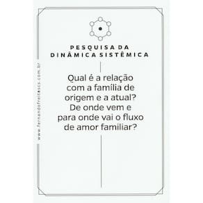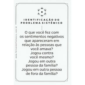 Cartas Sistêmicas Avançadas - Cartas para Constelação Familiar Esse material foi desenvolvido, com o objetivo de ajudar os consteladores/terapeutas a tornarem-se profissionais cada vez melhores e obter recursos dessa poderosa ferramenta diagnóstica – A Constelação Sistêmica. Essas falas são importantes também para que o próprio terapeuta reflita, e a partir de suas respostas pessoais, do seu autoconhecimento, possa auxiliar de forma mais assertiva seus pacientes, no caminho para as dinâmicas mais saudáveis. As cartas são recursos de ampliação de consciência em todos os ambientes. Evidenciando problemas: As Cartas Sistêmicas Avançadas são frases mais elaboradas, que conduzem a profundas reflexões. Para quem é indicado: O conjunto das cartas é ideal para cada situação e paciente, alguns casos requerem frases levemente mais simples de entendimento, mas que tem o mesmo objetivo de conduzir a reflexões profundas, rumo à verdadeira raiz do problema. Em outros casos, perguntas mais elaboradas proporcionam maior compreensão do que está sendo investigado, identificado, conduzindo ao mesmo lugar de solução. 72 Cartas Sistêmicas, divididas em 4 fases: 1 - Investigação Diagnóstica 2 - Pesquisa da Dinâmica Sistêmica 3 - Identificação do Problema Sistêmico 4 - Solução Sistêmica Sugestão de uso presente no produto.