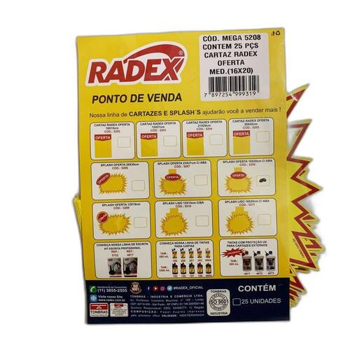 Cartaz em papel duplex splash, gramatura 250 grs / metro quadrado, utilizar produtos Radex como, pinceis permanente, kit de escrita, tintas para cartazes e tintas para cartazes UV para exposição externa. Pacote com 25