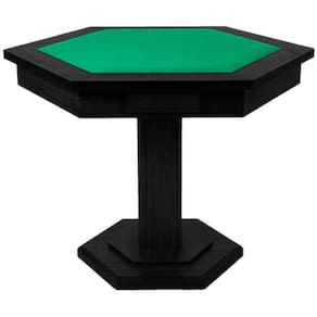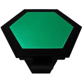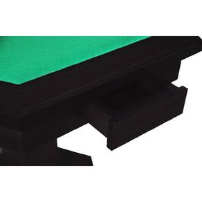 Mesa sextavada para jogar carteado confeccionada em MDF revestido em Ébano escuro com área de jogo em espuma envolvida com tecido políester verde, possui 02 gavetas e pé central sextavado.