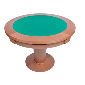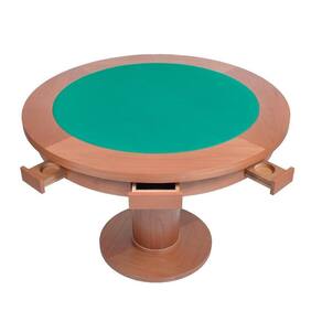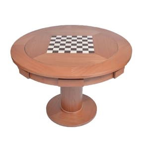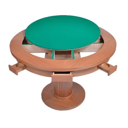 Mesa redonda para jogar carteado ou xadrez, confeccionada em MDF folheado e envernizado com tampo reversível para jogar carteado ou xadrez, possui 02 gavetas, 04 porta-copos e pé central redondo.