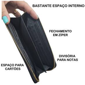 - Atenção ao excesso de itens dentro da carteira para não forçar os zíperes e costuras.
